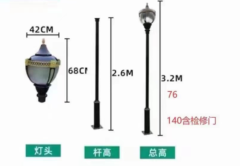 我公司的庭院燈具有多樣性、美觀性和裝飾環(huán)境的特點(diǎn),質(zhì)量保障,使用壽命長(zhǎng),樣式齊全,其主要部件由:光源、燈具、燈桿、法蘭盤(pán)、基礎(chǔ)預(yù)埋件5部分組成;可根據(jù)您的需求定制不同規(guī)格樣式。